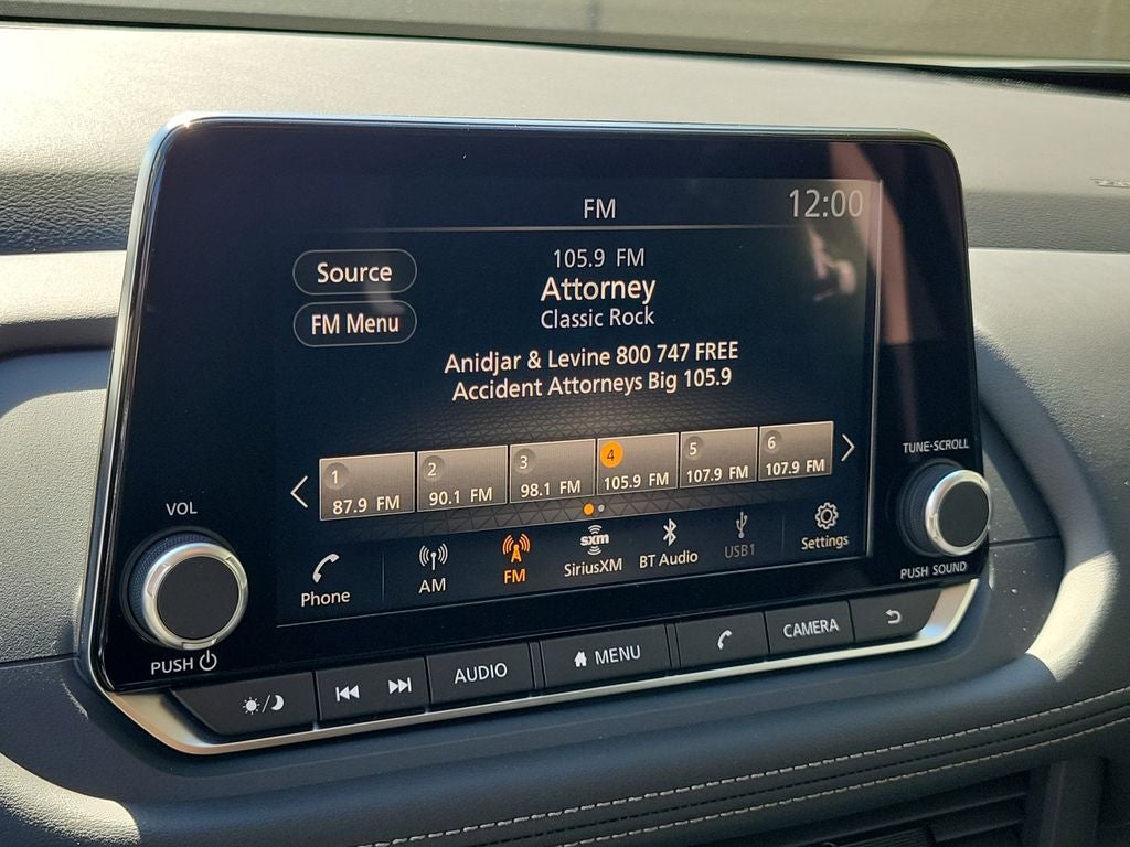 - Radio: AM/FM NissanConnect -inc: 6 speakers plus 2 tweeters, Apple CarPlay, Android Auto, 8" color touch screen display, Bluetooth®, 2 front USB type-C, Wi-Fi hotspot and NissanConnect Services powered by SiriusXM