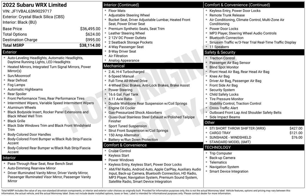 - Vehicle Name: Subaru WRX